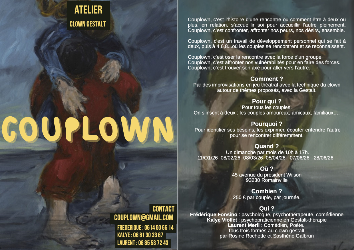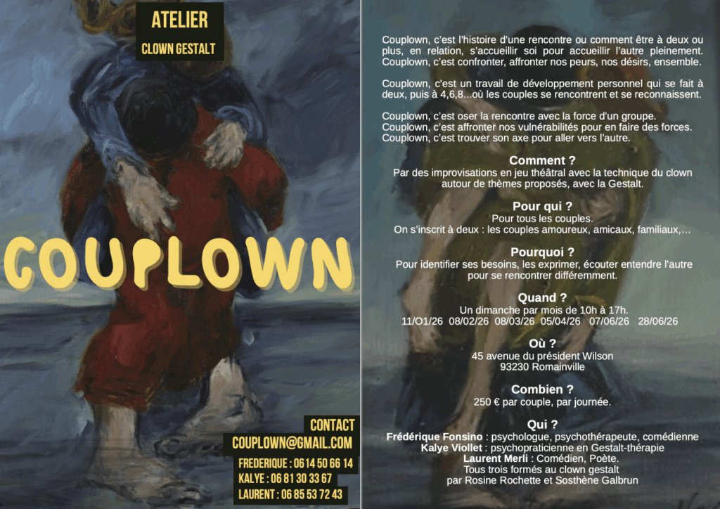 La Gestalt-thérapeute Kalye Viollet organise, avec ses confrères et collaborateurs d’expression scénique, des ateliers clowns dans un objectif thérapeutique pour s’explorer soi-même et chercher les ressources enfouies pour soulager ses difficultés psychiques et retrouver son bien-être.